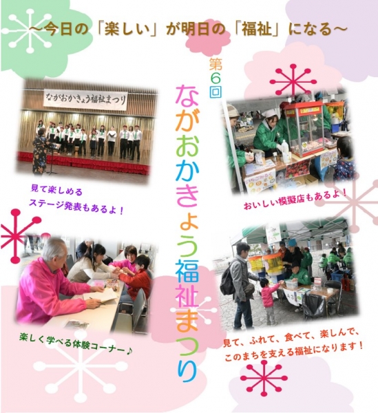 長岡京市社会福祉協議会では、長岡京市社協ボランティア連絡会との共催で、広く市民に福祉を身近に感じていただくことを目的として「ながおかきょう福祉まつり」を年1回開催しています。ステージ発表、ボランティア体験ブースや模擬店など来場者が楽しみながら福祉に触れてもらえる場をたくさん準備しています。開催の折には皆さん是非、会場に足をお運びください。